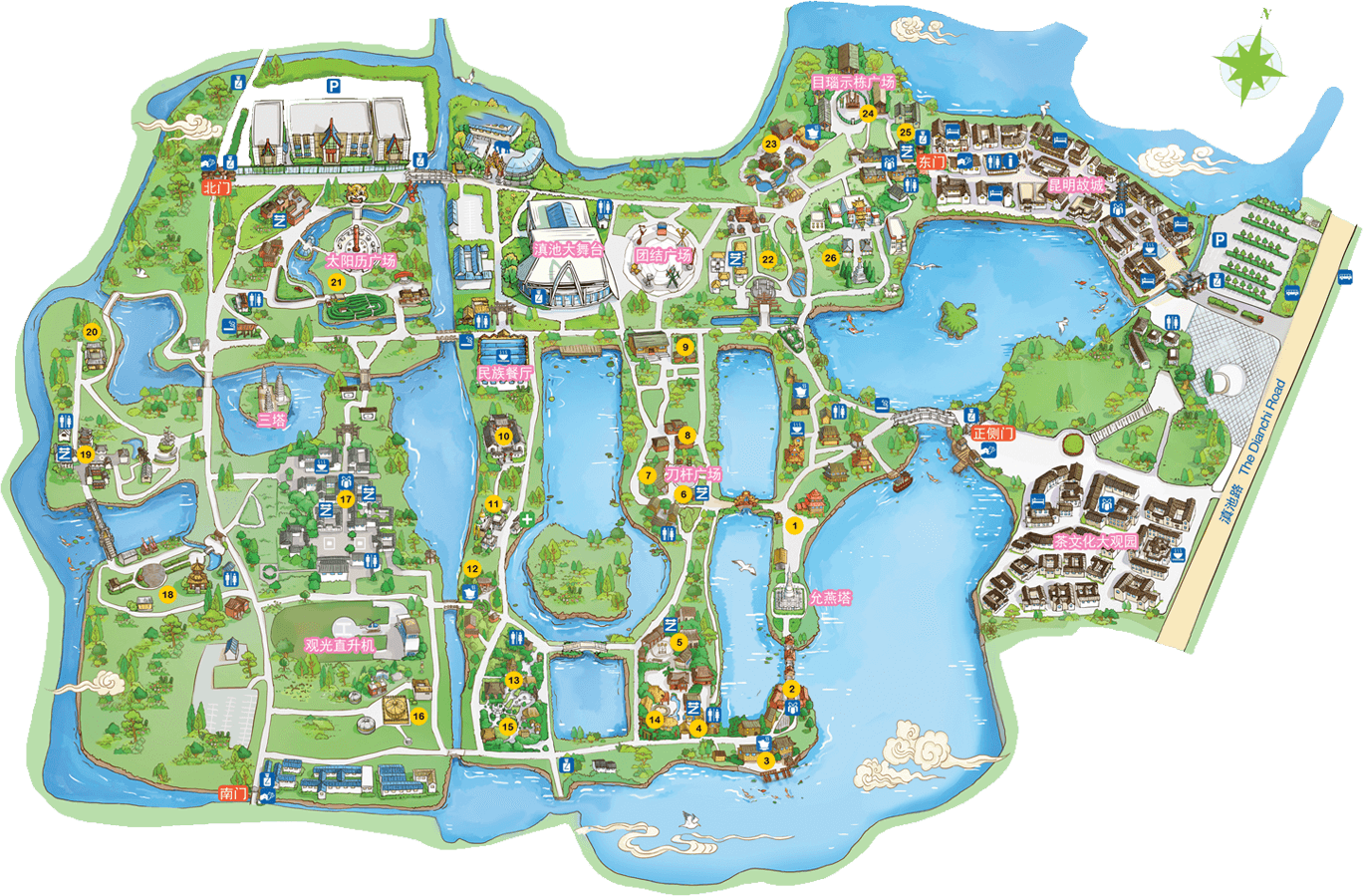 納西族人口約28萬,主要聚居在麗江市玉龍納西族自治縣。納西族村占地49.5畝。入口處有納西族保護神“三朵”塑像和以《創(chuàng)世紀(jì)》為題材的大型浮雕墻。重彩繪畫和精細木作為特色的“三坊一照壁”、“民居院”、“花馬坊”、“工藝樓”、“廊房”等重要建筑圍合烘托出“四方街”。納西族歷史悠久,文化豐富,著名的東巴象形文字被譽為象形文字的“活化石”。它是目前世界上仍在民間流傳使用的象形文字。用東巴文寫成的典籍,叫“...