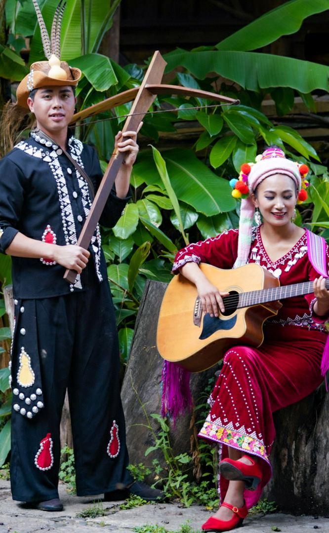 德昂族人口約1.7萬,主要分布在德宏州和保山市的潞西、梁河、瑞麗、隴川、隆陽等縣區(qū)。民居多為草排覆頂竹木結(jié)構(gòu)的干欄式建筑,眼前的德昂村建筑納入了能容納數(shù)十人居住的德昂大房子,氈帽頂?shù)男》孔?,還有頗具浪漫色彩的大公房、小公房……還建有“龍陽塔”標(biāo)志及佛教奘房、佛塔。德昂族民間普遍信奉南傳佛教,民俗活動與佛事活動關(guān)聯(lián)緊密。潑水節(jié)、開門節(jié)、關(guān)門節(jié)是重大節(jié)日。德昂族服飾色彩豐富,口頭文學(xué)特別是民歌創(chuàng)作活動...